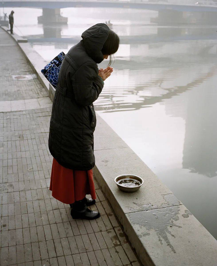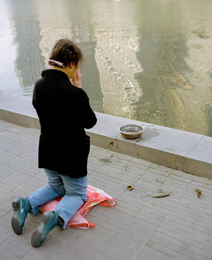 早晨沿着河边步道走,就能看到放生者。很多诵经的人,跪在地上双手合十,面前摆着一个脸盆,里面混杂着各种鱼类。他们仿佛是静止的,可以念一两个小时的经。在某个冬天清冷的早晨,河面上雾蒙蒙的,雾中有个戴着兜帽的女人站在河边,看不清面孔。