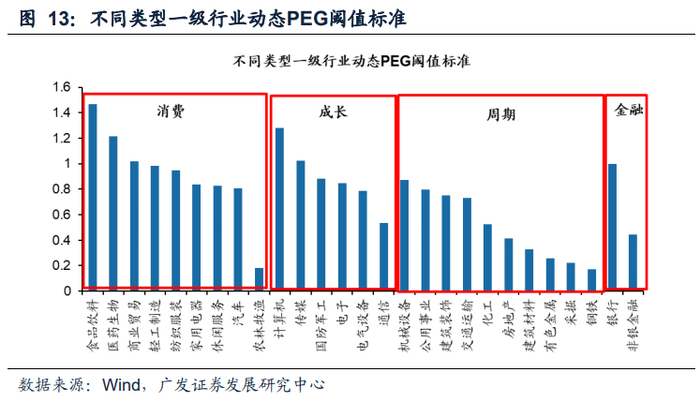 调整后的动态PEG判定阈值更具普适性,能够克服传统PEG选股策略的弊端。一方面,市场盈利定价较低的行业如银行、地产及部分周期性行业,天然PEG较低,简单用PEG<1筛选个股容易陷入“估值陷阱”;另一方面,盈利稳定、波动性较小的行业(如食品饮料、休闲服务等消费行业),以及未来成长性较高行业(如通信、计算机等),往往具有较高的PEG中枢,如用PEG<1的传统策略进行筛选则容易错失优质企业。因此,通过行业的动态估值和动态盈利计算所得的动态PEG中枢,适用不同类型行业均有相当针对性,普适性更强,选股效果更佳。具体的行业调整后的PEG阈值标准如下图:
