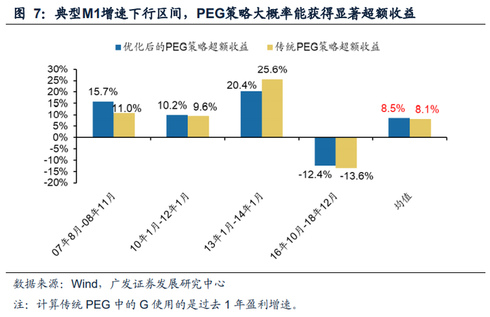 在典型的M1增速下行区间,无论是传统PEG策略还是优化后的PEG策略均大概率可获得显著的超额收益。自2005年股权分置改革以来,我国总共经历过4次典型的M1增速下行区间,分别是07年8月-08年11月、10年1月-12年1月、13年1月-14年1月、16年10月-18年2月。在这4个区间内,无论是传统的PEG策略还是本文接下来即将详细阐述的“优化PEG策略”均有3次获得了显著的超额收益,两种策略的期间平均超额收益均超过8%。同时,在4个区间内,优化的PEG策略的收益率3次超过传统PEG策略,也证明了优化的PEG策略的优势,我们将在下文具体阐述其构建逻辑和方法。