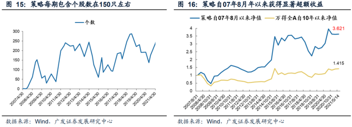 优化的PEG策略在应用中具备2大特性:一是信用收缩过程中大概率获得较为显著的超额收益,二是自07年8月以来相较万得全A获得明显的超额收益。自2007年8月以来,优化的PEG策略所筛选出的个股数量开始呈现较为稳定的态势,每期可选入个股数在50-300个之间,均值约在150只左右。因此优化的PEG策略可以构建稳定的组合进行07年8月以来的收益率回溯。通过回溯可以发现:(1)无论是从M1同比增速下行的角度还是社融增速下行的角度来说,在引用收缩期间,优化的PEG策略均大概率能获得较为显著的超额收益;(2)优化的PEG策略自07年8月至今累计净值为3.62,同期万得全A累计净值为1.41,策略相较万得全A获得了显著的超额收益。