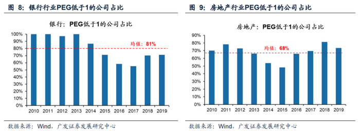 传统PEG选股方法常常会“高估”特定类型的行业的估值与盈利的匹配程度。2010年后,随着中国经济逐渐进入“存量经济”时代、监管方式也从“粗放式监管”转变为“精细化监管”,个别行业如银行、房地产的盈利潜力中枢下行。在此背景下,市场对银行、地产等行业的盈利定价偏低,导致这些行业的市盈率中枢维持在低位,天然PEG较低,往往整个行业PEG低于1的个股占比大幅高于50%。因此当我们用传统方法简单用PEG<1筛选个股时,容易“高估”个别行业的估值与盈利的匹配度,选入较多的此类行业个股。