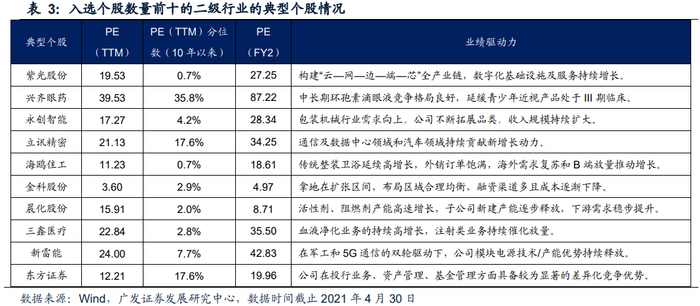 ●行业特征:从一级行业数量看,策略最新一期调仓后(21年4月末)个股数量前五的行业是医药生物、电子、计算机、机械设备、轻工制造。从更为细分的二级行业看,个股数量前十的行业是计算机应用、化学制药、专用设备、电子制造、家用轻工、房地产开发、化学制品、医疗器械、电源设备、证券。策略最新一期入选个股名单请联系广发策略或对口销售。