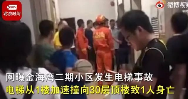 有网友爆料称:5月23日,广东湛江一小区发生电梯事故,电梯从1楼加速撞向30层顶楼,事故导致致1人身亡。