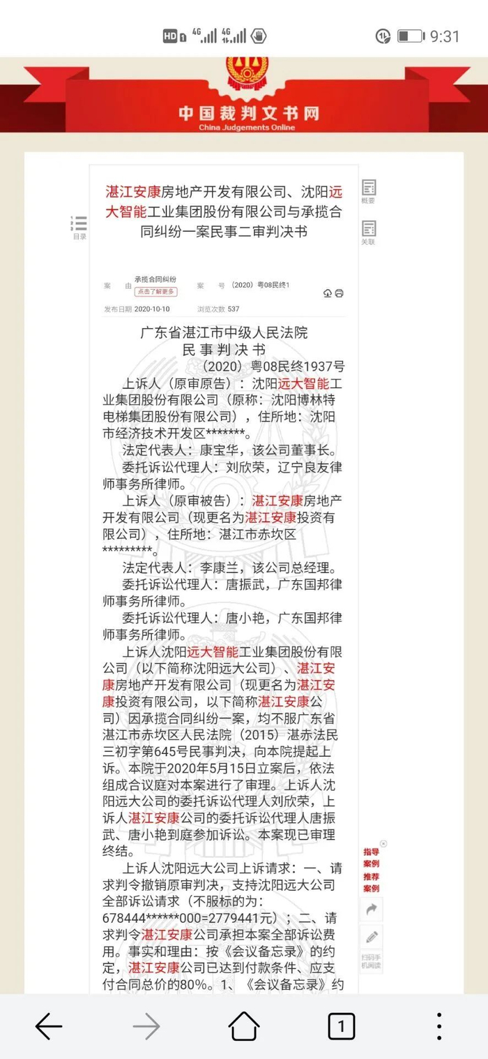 在湛江市市场监督管理局的调查结论没有出来前,关于这场电梯事故的原因和责任,外界尚无法进行评判。但值得一提的是,围绕金海湾二期电梯安装工程,远大智能曾与小区开发商湛江安康房地产开发有限公司(现已更名为湛江安康投资有限公司,以下简称湛江安康)产生诸多纠纷,并对簿公堂。