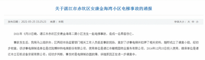 5月25日,湛江市市场监督管理局通报称:“经初步核查,该涉事电梯制造单位是沈阳博林特电梯股份有限公司,使用单位是湛江市橄榄园物业服务有限公司,2014年12月15日投入使用,维保单位是湛江市立石机设备安装有限公司。经初步判断,事发时是电梯制动器故障,详细原因正在进一步调查中。”