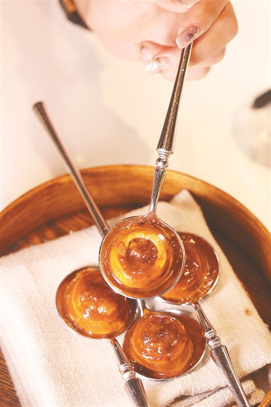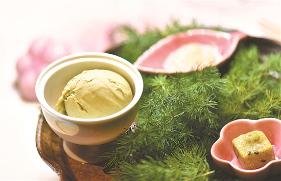 甜品的味道也“很客家”,借助酒心巧克力的制作原理,巧克力包裹着一口正宗河源特产上莞茶;而用上莞茶、开心果做的冰淇淋,吃之前浇上一小勺燕窝,口感清新又满足。