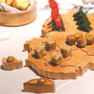 该餐厅其中一个招牌菜——前菜“青红黄白黑”在味觉上让人惊喜连连:外形很西式,但吃进嘴里只要你是客家人,几乎都会暗暗点头。而且四款小点吃的次序也很有讲究,比如以新鲜翠绿的枸杞叶做成的啫喱,包裹着用猪肝、鹅肝做的慕斯,冰凉鲜香,三种味道都十分清晰,很有吃枸杞叶滚猪肝的感觉。