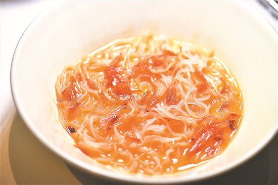 主食是招牌龙虾汤河源米粉,大厨用1:1的波士顿龙虾和明虾做汤,搭配河源特产米粉,出锅前撒上一把香脆咸鲜的台湾樱花虾,汤头鲜甜顺滑,和着很多人都爱吃的客家米粉,即便此时你已经很饱,都会连最后一口汤也不放过。
