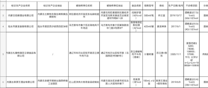 分别为:内蒙古驼峰酒业有限公司生产的一批次闷倒驴酒(60%vol),酒精度与产品标签标示值不符;