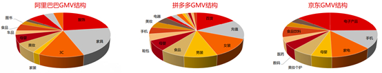 阿里巴巴、拼多多品类结构多元化;京东品类结构相对单一,带单品类占比较高。