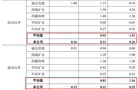 另外,负债率积压,导致金徽矿业的在短期内的偿债能力也较弱。报告期内,金徽矿业的流动比率分别为0.36、0.13、0.16,速动比率分别为0.35、0.11、0.15,低于同行业可比上市公司平均水平。