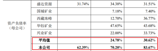 据招股书显示,2018年末、2019年末和2020年末,公司资产负债率(母公司)分别为83.67%、70.20%和62.39%,而2018年和2019年行业的平均值为30.62%和24.78%,超出行业水平,是行业平均值的2倍以上。