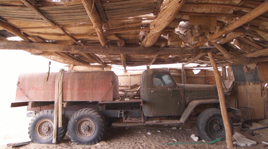 除了高温,极度缺水是摆在老人和梭梭树面前另一个难题。额济纳旗的平均水位是9-10米,地势稍高的地方就没有水,打井需要两三天才能出水,遇到故障则需要一周。为了维持梭梭苗的生长,老人开着一辆货车给梭梭苗浇水,每年2-3遍。十多年期间,用坏的车轱辘已经堆满了车棚,车身也已经在风吹日晒中变得斑驳陆离。