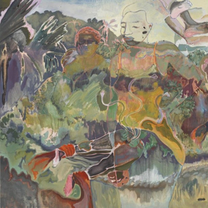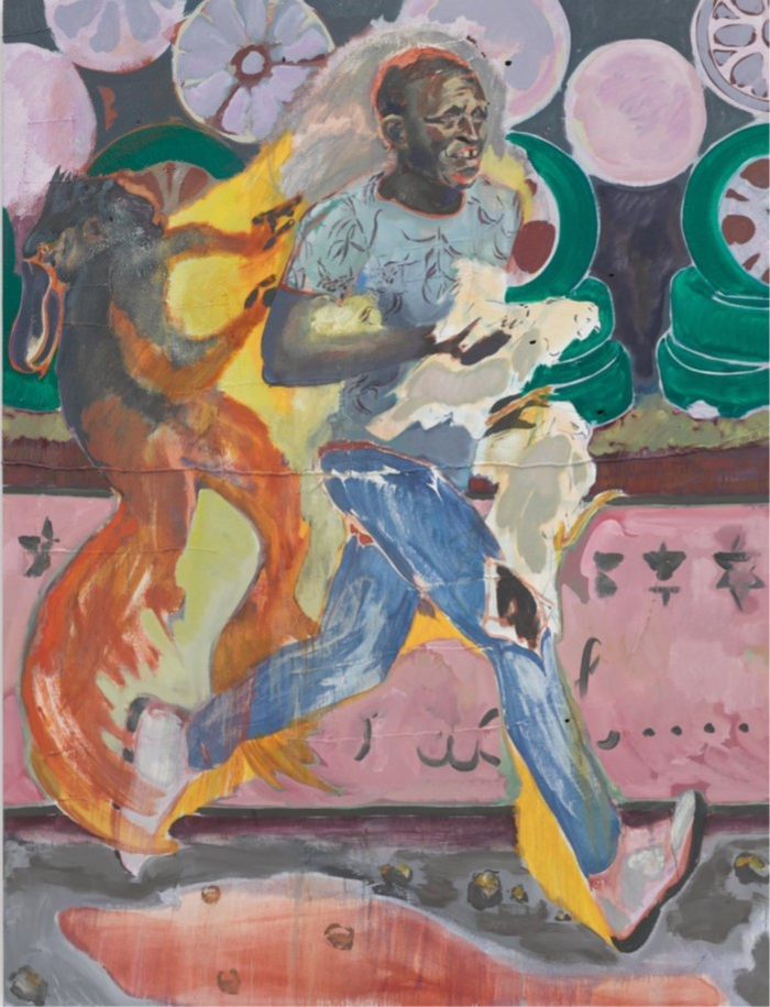 阿米蒂奇在大尺度上作画,他的自信是合理的。他有趣而让人困惑,讽刺而充满人情味。他拥有戏弄旁观者的惊人能力。当你走过他的内衣猩猩模特,你会看到一群狒狒以传统裸体模特的方式摆着姿势,优雅地弹开一串香蕉,那姿势就像安格尔或者提香的画。这样的玩笑击中了欧洲油画传统的核心,阿米蒂奇为了自己的意图大大地改造了这种传统。阿米蒂奇1984年出生于肯尼亚首都内罗毕,后来在伦敦接受训练,如今在两地工作。他戏仿了欧洲艺术表现地点和人物的方式。他的“裸体”狒狒镇定地在雨林的树荫中摆出造型,这是一种对于欧洲绘画中描绘异域浪漫风情的荒诞演绎,这种传统可以追溯到18世纪威廉·霍奇斯(William Hodges)描绘的塔希提女人,德拉克罗瓦(Delacroix)的《阿尔及尔女人》以及高更(Gauguin)的岛上风情。但是倘若在一个超现实恐怖故事中,身处热带的某位欧洲艺术家爱上的不是岛上少女,而是狒狒呢?这就是阿米蒂奇在画中想象的让人无所适从的可能。