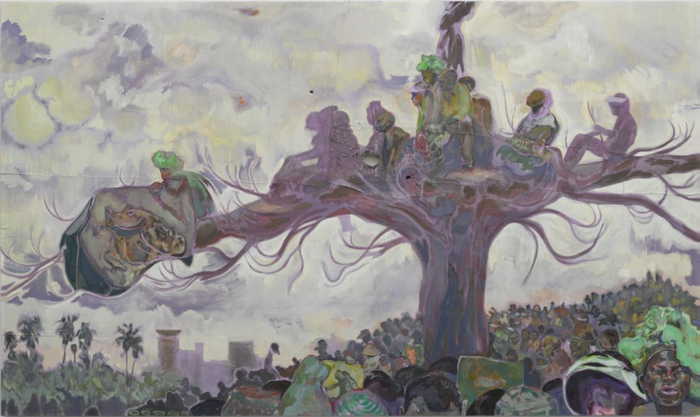 事实上,这种戈雅式的怪诞戏剧比比皆是。在一幅穿着内衣的猩猩画像中,它正从深蓝绿色的雨林中走出,叫人瞠目结舌。接着是人群观看政治活动的大场景,很多人坐在低矮的宽枝树上,仿佛出自戈雅的某一幅阴暗群像。这位描绘不安的西班牙大师想必会喜欢《手拖车》(Mkokoteni,2019)中让人不适的戏剧,画中一位老人拖着两个年轻人,其中一个在另一个的背上,身处独轮车和人力车之间。