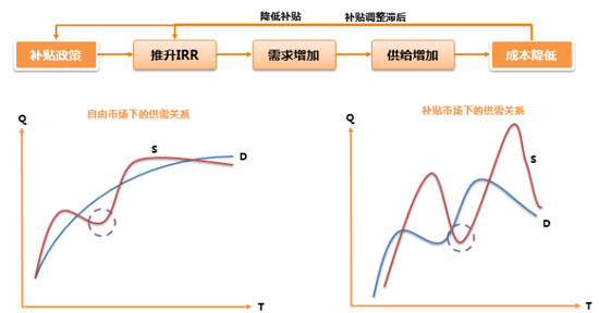 市场对于光伏行业的成长空间普遍看好,但对这个行业给出的估值却普遍偏低,这背后其实有一个非常有趣的逻辑。在我们研究商业模式的时候,首先会去想企业如何赚钱。我们知道,光伏电站的产品就是电,它有两个销售途径:一是卖给国家电网,二是卖给企业。在国家电网这条线,他们的竞争对手是当地火电、水电的价格;而卖给普通企业,他们的竞争对手是工商业电价。电站运营周期一般为20-25年,因此评价项目的内部收益率(IRR)是影响电站运营商投资需求的核心指标。而从商业模式来看,影响IRR的要素主要有资金成本、土地租金、屋顶资源、系统成本、光照小时数、补贴电价等;由于光伏的发电成本远远高于水电和火电,所以无论卖给谁,企业的投资回报率都是负的,而在影响IRR的要素中,资金成本、土地租金、屋顶资源、光照小时数均为资源要素,是行业内企业无法控制的外部变量。因此,在过去的十多年中,补贴电价和系统成本成为驱动行业需求的关键因素。光伏行业的发展周期随着国家的电价补贴政策而波动成为过去多年比较典型的光伏行业的商业模式。