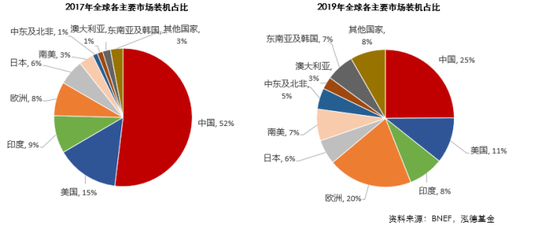 二是装机市场格局:中美印三家CR3由17年的76%下降至19年的44%,单一市场风险大幅下降,全球多个国家光伏需求上升,多点开花。全球多区域需求发展,保证了未来市场增长的确定性。