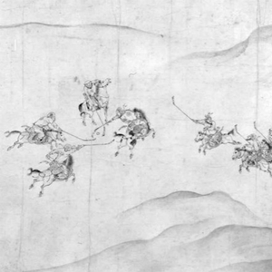 这幅《便桥会盟图》长卷,可分为三个部分:第一部分绘各类马上运动和马戏表演,有骑手站在马上举大旗,还有骑手在马上倒立,这一部分还能看到在唐朝风靡社会的马球比赛;第二部分仿佛是骑手们累了正在歇息,马儿随意在稀疏的树间闲走;第三部分就是便桥会盟的场景,便桥北聚集了一小群人,按照史实,这群人应是突厥人,但陈及之这位元朝画家,却让他们穿上了蒙古人的服装,他们望向对岸,而便桥南是盛大的仪仗,李世民端坐在华盖下,庄重威严,整个长卷到此为止。