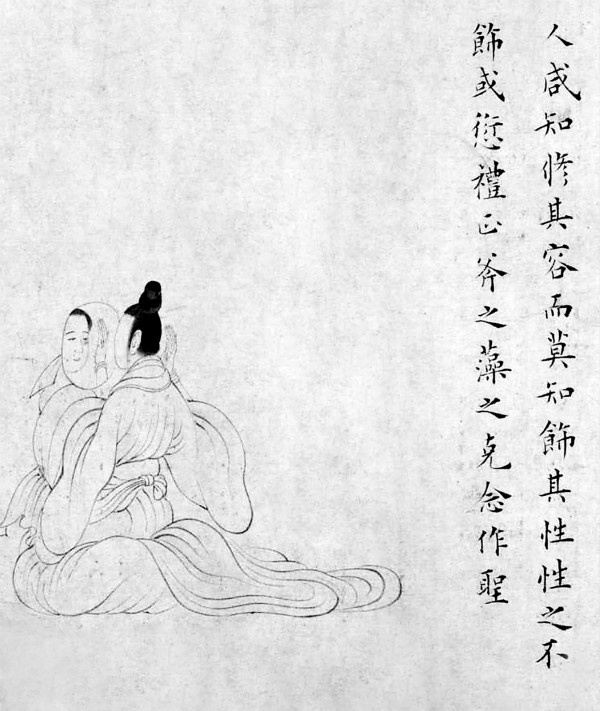 这些故事体现了当时通行的一种观念,今天的观众在欣赏《女史箴图》时更容易为画家精湛的笔法而吸引,尤其是画家描绘人物衣饰的线条,简约、流畅、飘逸。这种绘法有一个特定的名称,叫“高古游丝描”,又有“春蚕吐丝描”的形象说法。