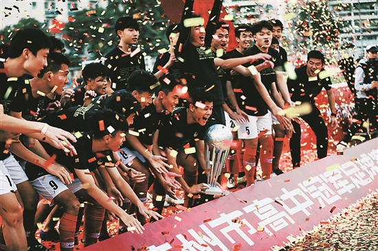 今年5月12日举行的“第七届广州市中小学生足球联赛”男子超级组决赛中,华附又凭借点球,以4比3击败对手夺得冠军,再一次创造了奇迹。这个比赛代表了广州市校园足球的最高水平角逐,是打通“校园足球”与“职业足球”的一个孵化器。华附高中足球最近七八年来发展神速,先后获得2017年广东省“省长杯”冠军、2019年广州市高中超级杯冠军、2019年全国高中足球赛冠军,被外界美誉为一支“学霸球队”。通过足球这个平台,华附校队至少有两名特长生最后考入了清华大学,也有人进入了北京的高校并且目前在中甲联赛效力。