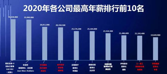 2020年,君实生物非执行董事武海以3543万元年薪领跑上市公司高管年薪排行榜。安迪苏的副董事长、总经理Jean Marc Dublanc、中芯国际的执行董事梁孟松、金科股份的原总裁喻林强、迈瑞医疗的董事长李西廷分列2-5位。