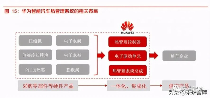 基于一体化集成化的设计理念,华为在热管理方面的布局将围绕控制器和系统总成领域。华为并不 做热管理系统中的各零部件等硬件。