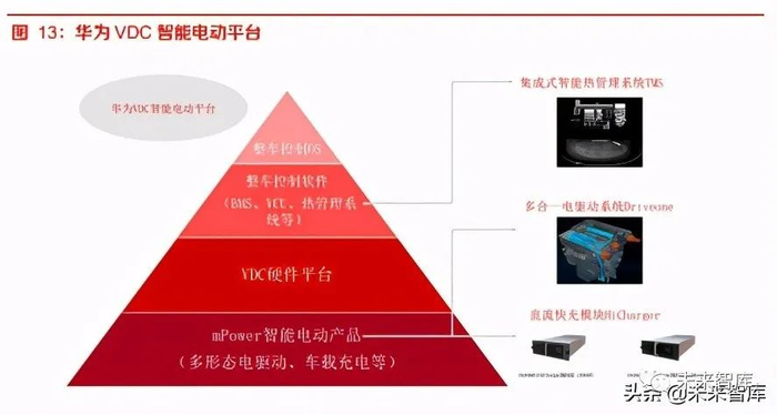 在2019在世界智能网联汽车大会上,华为首次提出打造VDC智能电动平台,集成了整车控制OS、 整车控制软件(BMS、VCU、热管理系统等)、VDC 硬件平台及 mPower 智能电动产品(多形态电驱动、车载充电等),目前明星产品包括直流快充模块 HiCharger、多合一电驱动系统 Driveone 和集成式智能热管理系统 TMS 等。