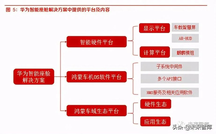 华为智能座舱解决方案主要包括三大平台,分别是鸿蒙车机 OS 软件平台、鸿蒙车域生态平台及智 能硬件平台。华为将通过“车机 OS 软件平台+车域生态平台+智能硬件平台”为数字座舱提供更多 交互,从而构建人-车-生活的全场景出行体验。