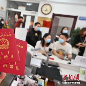 资料图:5月20日,内蒙古呼和浩特市,新人们排队办理结婚证。中新社记者 刘文华 摄