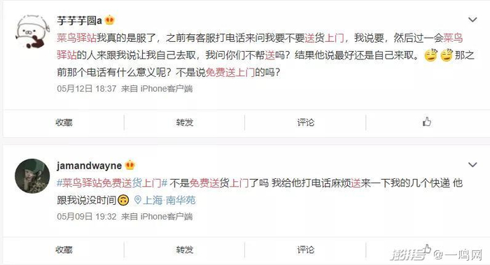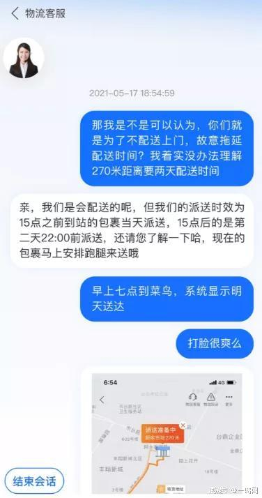如上图,客服表示,下午三点前的快递当天配送,三点之后的第二天晚上10点前配送。这也说明,菜鸟驿站为了拖延配送时间,会把收到上门件的快递在下午三点后入库。菜鸟为何这么做,有两个原因,一是前面提到的运力不足;二是很多用户心理作用,看到快递到菜鸟了,需要第二天再送,还不如自己去到店取,第二点也是菜鸟驿站求之不得的。因为他收了代快递小哥送上门的那份钱,快递却被用户自己拿走了。