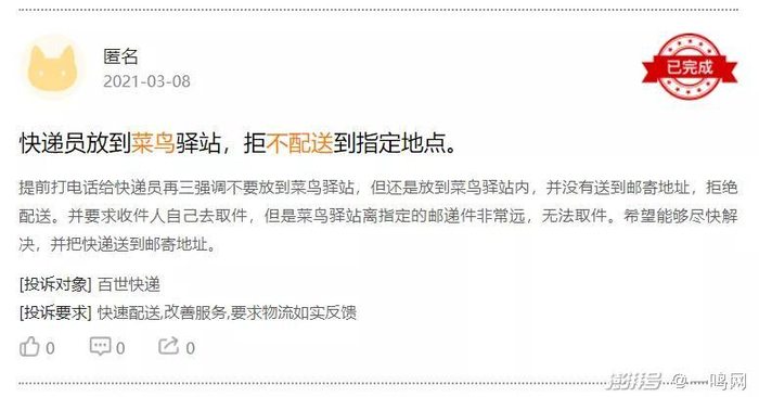 这已经不是小柴第一次听到朋友这么吐槽了,前不久,有朋友也表示,自己在菜鸟设置了上门送货选项,但菜鸟最终也是打电话让去门店取件,到了门店,菜鸟两位工作人员躺在躺椅上玩手机,直言让朋友自己去找,朋友在表明自己找不着,让工作人员取之后,工作人员极不耐烦的找到快递,扔在了自动取件机上。