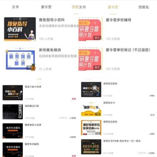各机构推出的服务内容大同小异,总结来看有三个方面:推免信息咨询、个人文书材料修改、专业课程与面试辅导。培训的方式以线上咨询和网课培训为主,很少进行线下培训。