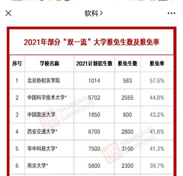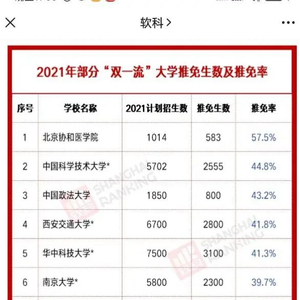 软科统计2021年部分“双一流”大学推免生数及推免率