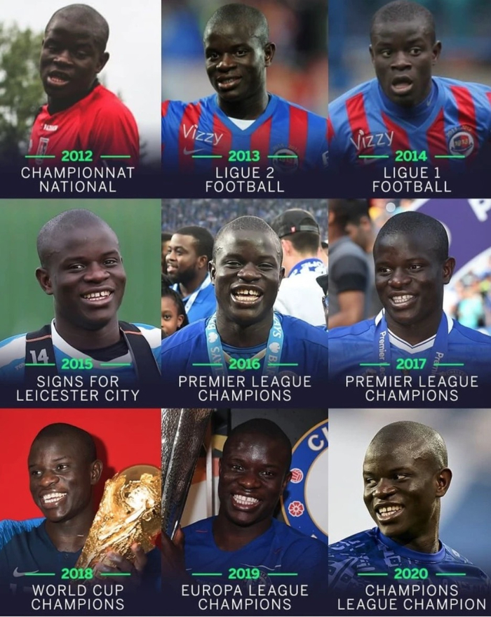 9年前,也就是2012年,当切尔西第一次问鼎欧冠时,坎特还在法国第三级别联赛踢球,而且联赛里只出场1次。2013年,坎特才加盟法乙球队卡昂。到了2014年,坎特完成了法甲首秀。2015年,他转投莱斯特城,转会费只有900万欧元。