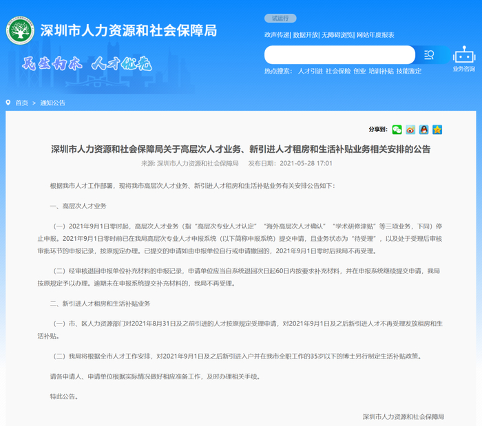 5月28日,深圳人社局发布《关于高层次人才业务、新引进人才租房和生活补贴业务相关安排的公告》,这意味着,在拟修订户籍迁入政策之后,深圳对人才政策也正在作出调整。《公告》指出,市、区人力资源部门对2021年8月31日及之前引进的人才按原规定受理申请,对2021年9月1日及之后新引进人才不再受理发放租房和生活补贴。与此同时,对2021年9月1日及之后新引进入户并在深圳全职工作的35岁以下的博士另行制定生活补贴政策。