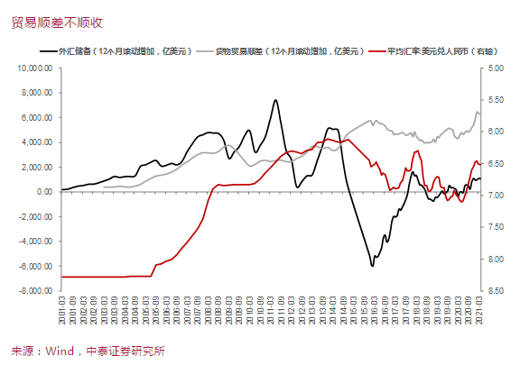 从国际收支角度,外汇供求结果主要反映在两方面:经常账户,即进出口贸易顺差“吸收”,资本和金融账户,即国内企业或部门跨境投资“流出”。全球不规则复苏背景下,中国出口的强劲出现了明显的“顺差不顺收”的加剧现象。整体来看,贸易顺差实际带来的资金流入规模仅为顺差的42%,较疫情前44%的低位,下降2个百分点。同时,央行的外汇储备增加的幅度也远不及商业银行结售汇顺差规模。2020Q3至2021Q1商业银行结售汇顺差从107亿扩大至940亿美元,而同期外汇储备仅增加274亿美元。