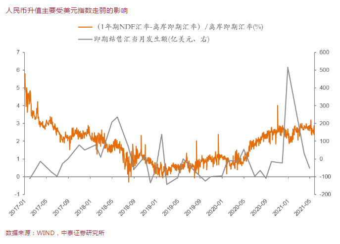 中泰策略分析师肖雨认为,3月底以来人民币快速升值过程中,我们注意到三个事实特征:首先,包括CFETS、BIS、SDR在内的三种人民币一篮子汇率指数变化不大,区间涨幅明显小于人民币对美元汇率涨幅,更小于美元指数跌幅;其次,通过对比人民币中间价估算值和实际公布值(含逆周期因子因素),可以看到从2020年10月宣布逆周期因子“暂停”以来,央行在人民币对美元中间价报价过程中并未过多干预汇率的市场波动;最后,从反映汇率预期的1年期NDF汇率和即期结售汇规模两个指标看,市场并未形成较强烈的升值预期。因此,这一轮人民币升值主要受美元指数走弱的影响,和国内政策、经济环境的关系较弱,如果美元指数企稳反弹,人民币升值趋势可能放缓,甚至可能反向变化,这也和最近央行官方表态看法较一致。