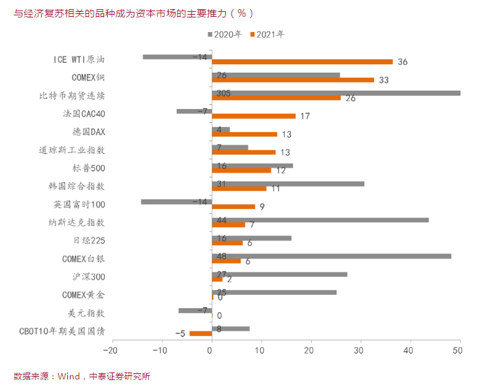但在全球主要大类资产中,A股今年的表现依然较为靠后。对比2020年和2021年主要大类资产表现,全球资产配置的逻辑非常清晰,如果说2020年主要在交易流动性,2021年的主线则是主要在交易复苏,受疫情冲击最大的原油今年表现最好,同时疫情冲击较大的欧美股市转向疫苗驱动后开始跑赢新兴市场,而对流动性最为敏感的黄金、白银较去年表现平平。