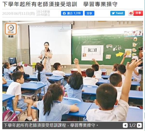 2020年6月10日,香港教育局就教师操守培训向全港学校发通告,指出在下个学年开始,新入职的教师必须在3年内接受由教育局提供的30小时核心培训,包括“教师专业身份”及“展现专业操守和价值观”等课程。(新闻截图)