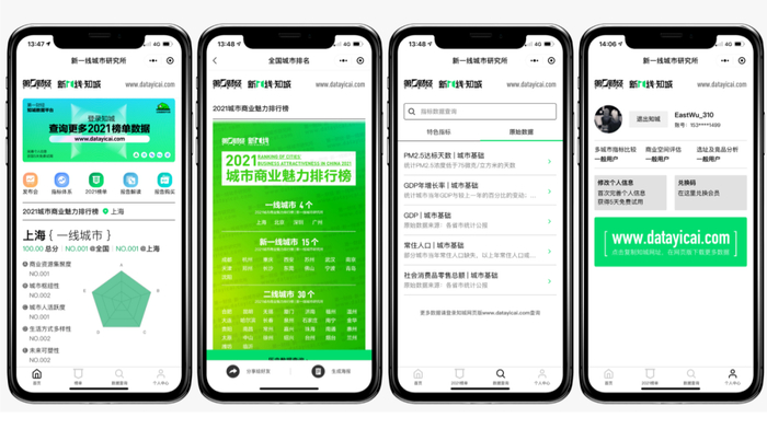 在知城小程序上,大家可以查询到今年最新出炉的城市排名结果以及部分历年的数据。小程序和知城数据平台的用户体系是互通的,所以在小程序上注册会员并填写相关信息,就可以在知城数据平台上免费试用5天。
