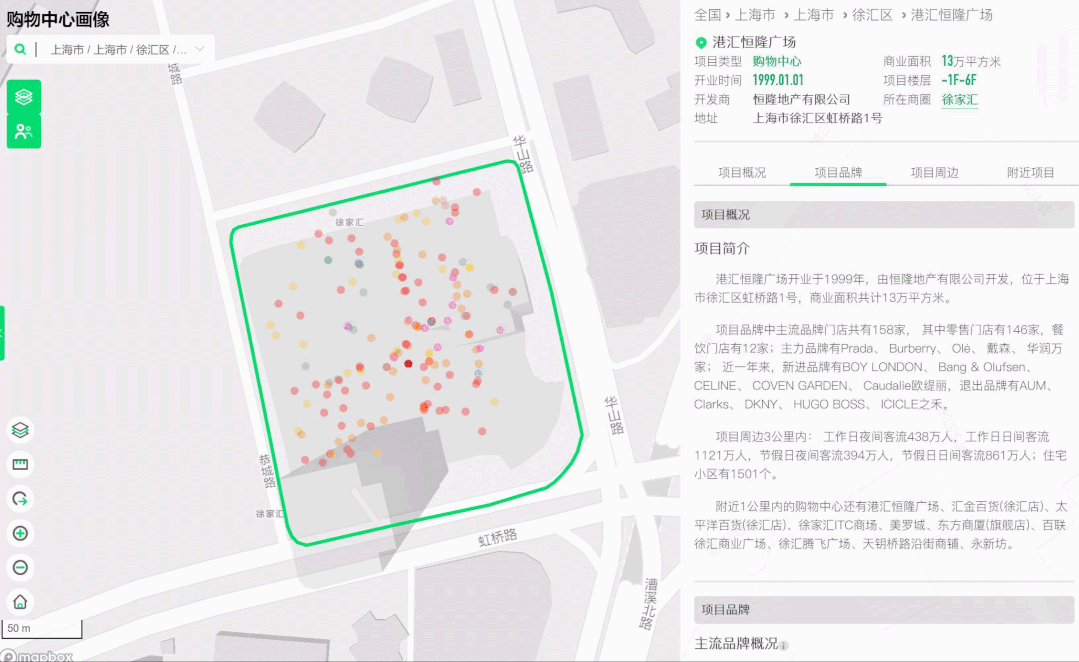 选址研究则是一个更具功能性的板块。我们选取城市商业的重点区域——购物中心、商圈、地铁站、小区、学校等等,查看它们在地图上的分布状态。用户通过选择想要了解的重点区域,如购物中心,就能看到重点区域内或周边的品牌入驻情况、竞争环境以及购物中心在全市各地块的数量等情况。