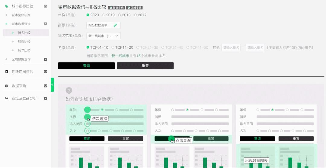 「城市指标比较」主要有四个核心功能,分别是城市整体研判、城市数据查询、区域数据查询。用户可以基于城市商业魅力排行榜查询城市、区域的统计数据,并可以做历年比较、排名查询及城市对标。数据结果以可视化图表的形式输出,用户也可以下载原始数据。