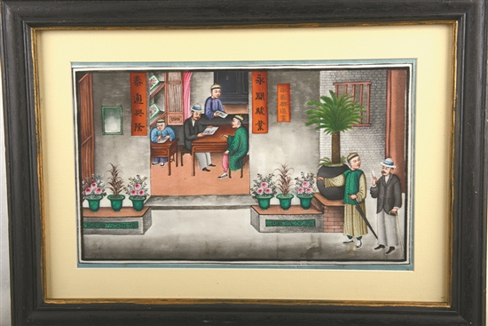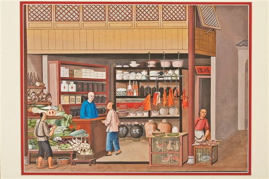 又如,外销画中描绘了广州街道上繁多的商铺,出售之物包括生活用品、家具杂货、文玩书店、金银钱庄、茶烟布料、肉铺酒馆等等,种类之多让外国人瞠目,称这些街道就像一座“博物馆”“有你从未见过的一切。”