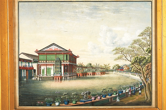 清代海外贸易为广州十三行行商带来巨大财富,嘉庆年间,各大行商纷纷在城郊开馆列第,竞逐奢华。当时,伍、潘两家的私人园林最负盛名,是来华西洋人游踪必至之地,也是外销画中经常出现的题材。到了十九世纪,行商潘氏的远亲潘仕成以盐业发家。与他的祖先一样,潘仕成同样醉心风雅,不惜大掷金钱,在广州西关泮塘广占田塘,开辟园林,名为海山仙馆。亭台楼阁之多,气象之大,屡见记载,几番入画。如今几乎片瓦无存,但仍享有岭南第一名园之美誉,为后人津津乐道。