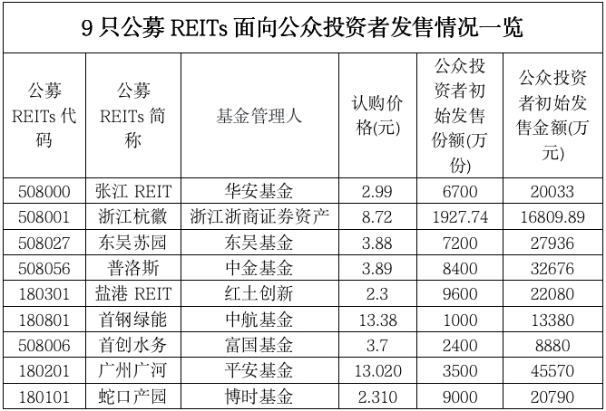 根据认购价格计算,9只公募REITs面向公众投资者的初始发售金额合计大概在20亿元左右,拟募集金额最多的广州广河REITs面向公众投资者的销售金额也不到5个亿。