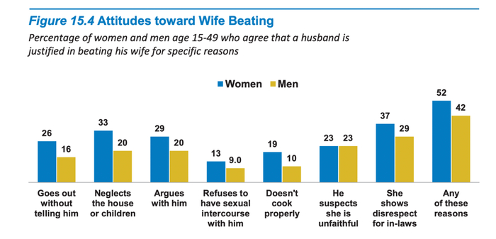 2015至2016的印度全国家庭健康调查(NFHS)数据显示,有52%的接受调查的女性认为丈夫对妻子施暴是合理的,这一数据甚至超过了男性的42%。其中还有13%的女性认为,如果丈夫因妻子拒绝性交,而对其施暴也情有可原。并且从数据上看,自2005-06年的调查以来,两性之间对家暴的态度并没有太大改变,但是认可家庭暴力女性比例却在上升。