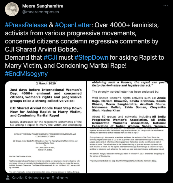 鲍德法官的这番言论很快在社媒上传开,引起了更多民众的不满。在一封致鲍德法官的公开信上,4000多人留下签名并要求他立马辞职。信中强调,“鲍德法官的言论不仅使丈夫对妻子进行任何形式的性、身体和精神暴力合法化,还使印度妇女在婚姻中遭受的酷刑正常化。”
