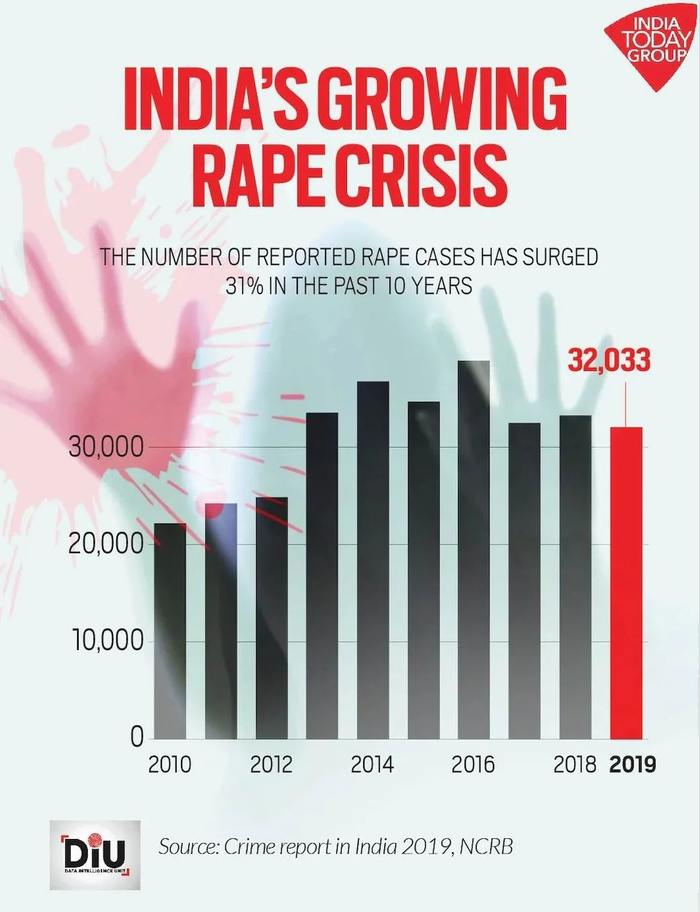 根据印度国家犯罪记录局(NCRB)的最新数据,2019年印度警方记录在案的强奸案件超过3.2万,平均每天88起,每16分钟就有一起强奸案发生。自2012年的印度黑公交轮奸事件(一名女大学生在巴士上遭到5名男子强奸)以来,首都新德里一度被视为“世界强奸之都”。全球和平指数2017年的报告,也将印度列为对女性旅行者最危险的国家之一。