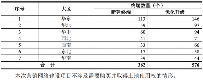 其中,建设期第一年拟新增门店110家,优化门店183家、第二年拟新增门店120家、优化门店190家,第三年拟新增门店132家、优化门店203家。