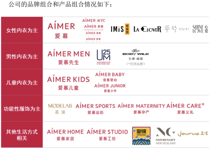 目前,爱慕(Aímer)、爱慕先生(Aímer men)、爱美丽(imi’s)、爱慕儿童(Aímer kids)、慕澜(MODELAB)和兰卡文(La Clover)是已形成一定规模的主力品牌;爱慕运动(Aímer sports)、乎兮(Huxi)等是正在培育的具备一定成长潜力的品牌。